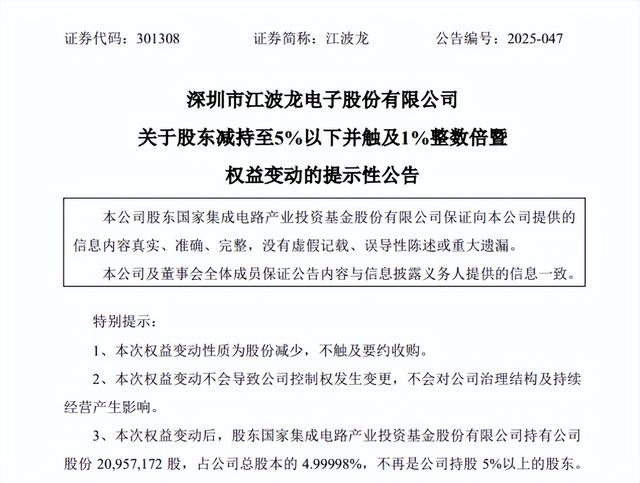 7月9日,江波龙公告称,公司股东国家集成电路产业投资基金股份有限公司已减持至5%以下,持股比例降至4.99998%。此次权益变动后,国家集成电路产业基金不再是公司持股5%以上的股东。减持期间为2025年6月19日至7月9日,通过集中竞价交易方式累计减持3,259,634股,占公司总股本的0.77769%。
